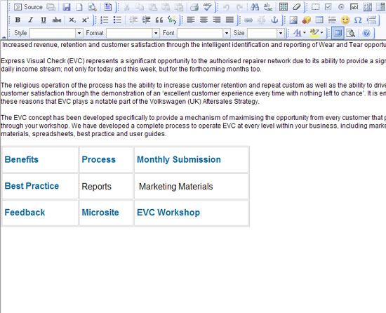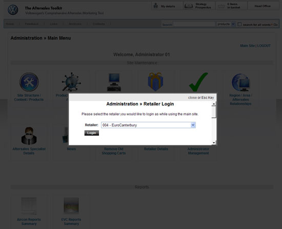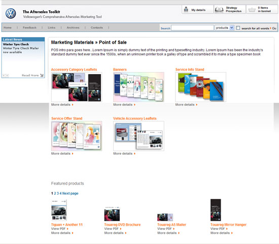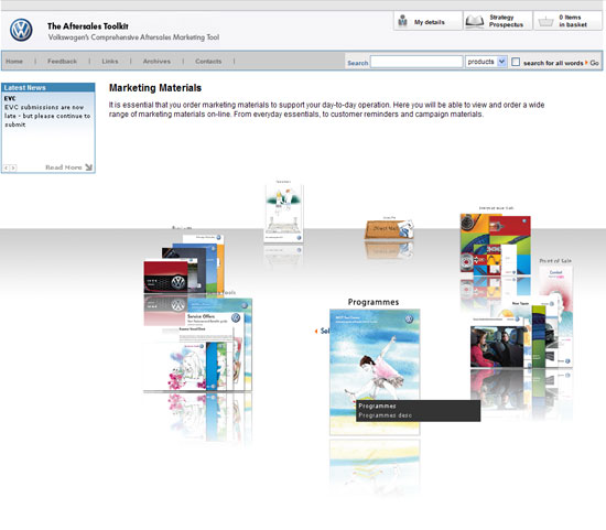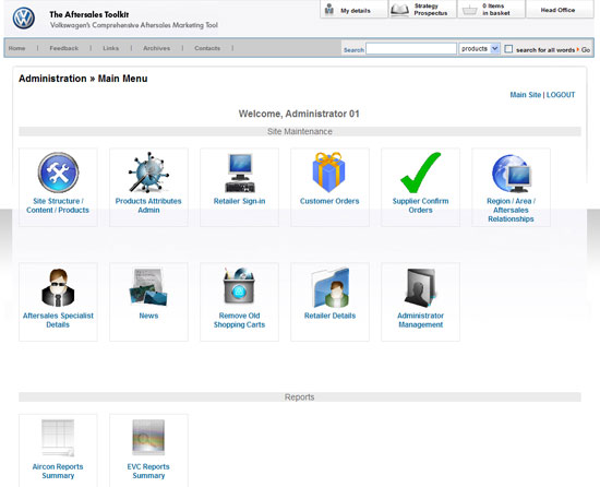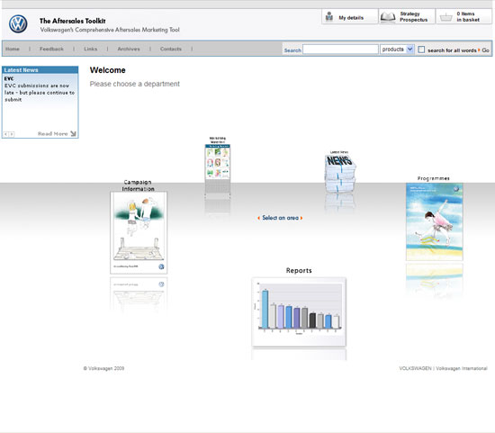 This is a comprehensive aftersales toolkit, serving as a fully content managed business extranet, ecommerce store and complex reporting system all rolled into one! It was designed to be comprehensive enough to replace the Volkswagen Service Toolkit and the Volkswagen Accessory Toolkit by fusing them into one mega site. The Volkswagen Aftersales Toolkit also houses several complex web applications including the Aircon Reporting Suite, the EVC Reporting Suite and the Tyre Selector Matrix. The site is used by Volkswagen retailers nationwide to purchase essential show room materials like leaflets and banners giving them the ability to customize individual aspects of their ordered products where applicable. Retailers also use this site to participate in schemes and initiatives set by head office as well as to download/submit reports to and from head office. The site also has modular administrative access. This allows multiple administrators to be assigned different access levels to administer specific areas of the site. For a more explicit breakdown of the features please view the case study on this site.